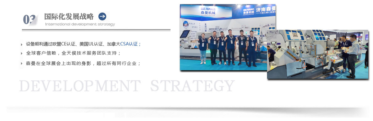 “森曼機械”作為全球門窗設(shè)備供應(yīng)商,本著"seaman"精神,勇立潮頭,拼搏創(chuàng)新,以爭做行業(yè)為目標,在行業(yè)前輩發(fā)展的基礎(chǔ)上,努力學(xué)習(xí),積極進取。目前公司產(chǎn)品涵蓋塑料門窗設(shè)備、鋁合金門窗設(shè)備、鋁幕墻設(shè)備、鋁木復(fù)合門窗設(shè)備及中空玻璃設(shè)備五大種類,近百個品種。公司產(chǎn)品銷售至全國各地及東南亞、非洲、東歐、北美等幾十個國家和地區(qū)。在這個競爭激烈的年代,我們正努力使我們的產(chǎn)品!